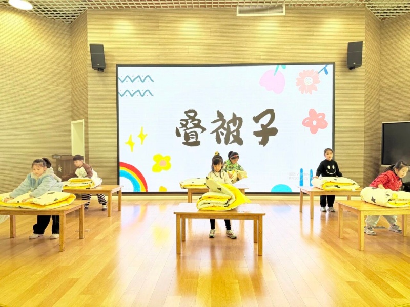 比赛按小、中、大三个年龄段分组进行。小班的萌娃们进行了叠毛巾、剥鸡蛋等基础技能比拼;中班小朋友挑战了叠衣服、整理图书和用筷子夹毛球;大班的孩子则展示了叠被子、整理书包等更复杂的技能,为幼小衔接做好准备。活动现场气氛热烈,小选手们个个神情专注,动作熟练,赢得了阵阵掌声。
